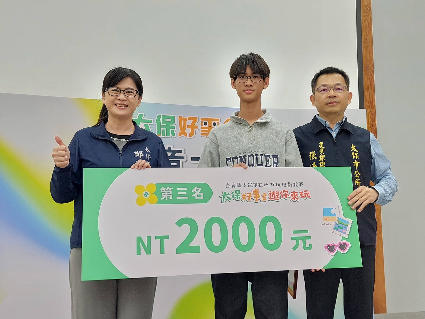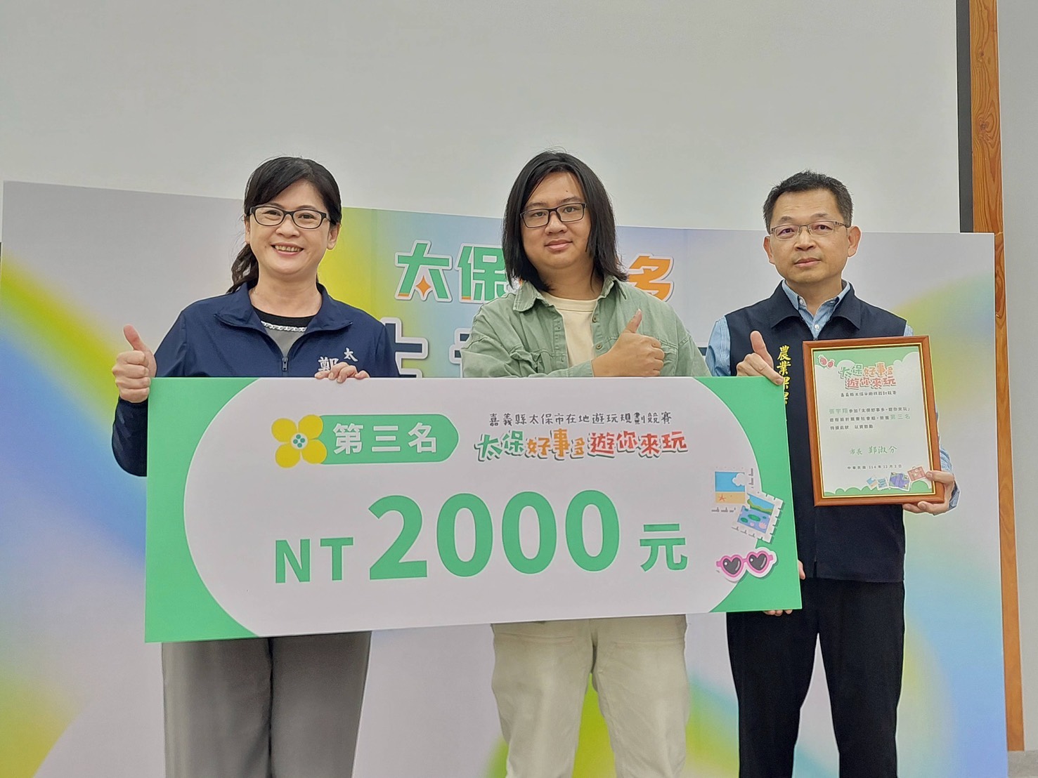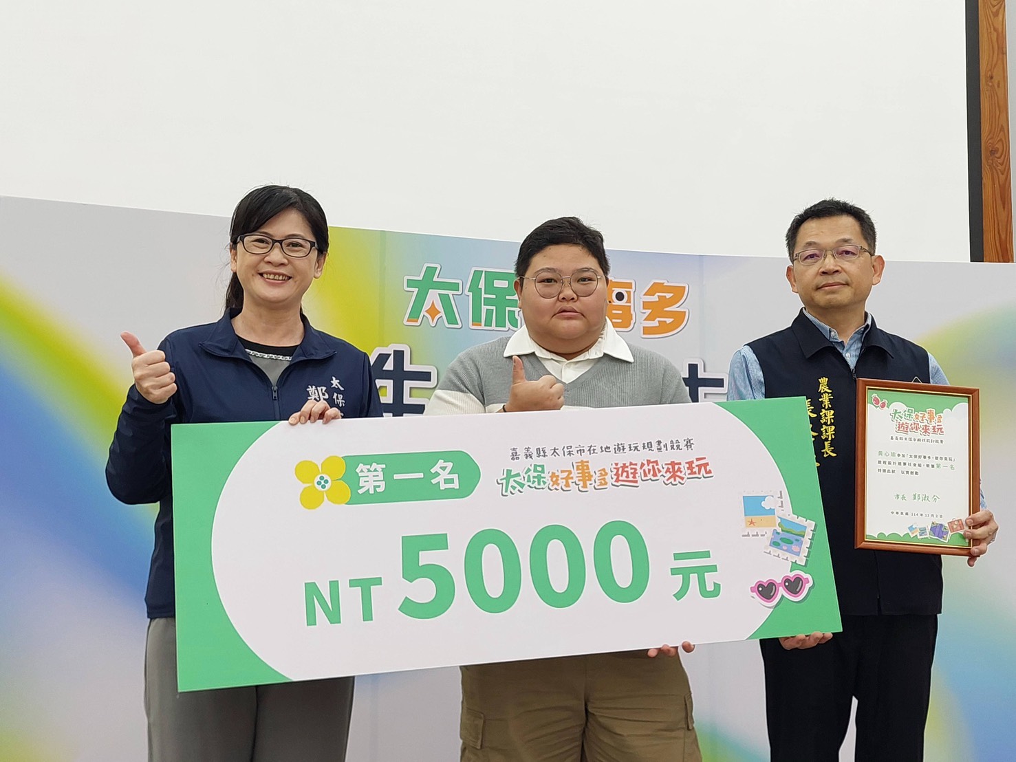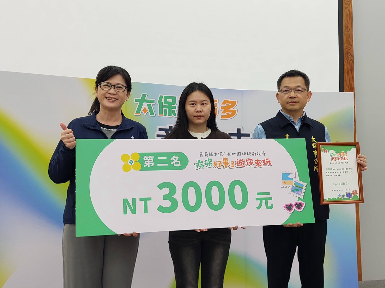 活動圓滿落幕!「太保好事多」競賽頒獎典禮直擊由太保市主辦的「太保好事多.遊你來玩」在地遊玩規劃競賽,迎來了最激動人心的頒獎時刻!這場競賽旨在鼓勵大家發揮創意,結合太保市內的觀光景點、體驗活動以及在地合作店家,設計出最深度的旅遊提案。頒獎典禮現場氣氛熱烈,匯聚了對太保充滿熱情的旅遊設計好手們|社會組|第一名:黃心俞第二名:李夢婕第三名:張宇翔佳作:陳佑臻(阿吉)|學生組|第一名:鄭玟縈第二名:黃培津第三名:徐唯哲佳作:張舒涵 學生組 第一名: 鄭玟縈 第三名: 徐唯哲 社會組 第一名: 黃心俞 第二名: 李夢婕 第三名: 張宇翔